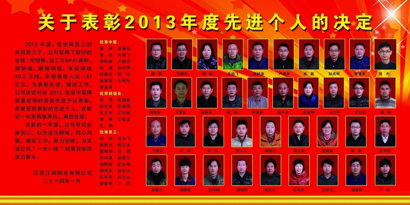 2013年度,在全體員工的共同努力下,公司取得了較好的業績:年銷售、加工Φ8mm銅桿、裸銅線、鍍錫銅線、束絞銅線40.3萬噸,年銷售收入達147億元。為表彰先進,推動工作,公司決定對在2013年度中取得顯著成績的各類先進予以表彰。希望受到表彰的先進個人,在新的一年里再接再厲,再創佳績。在新的一年里,公司號召全體員工,以先進為榜樣,同心同德、踏實工作、努力創新,為實現公司“一大一佳”經營目標而努力奮斗。優秀中層:唐 輝、吳春良、駱 耘、朱培飛、楊鮮春、盧斌聲、施 嘉、耿成明、蔣福良殷 杰、駱富強、王俊松、駱品其優秀班組長:黃 偉、朱國新、趙分良、張益琴、莊立中、王志超、儲 輝、王春龍、沈 翔優秀員工:吳 歡、符小飛、柳嬌云、陳志忠、董麗娟、蔣 超、朱洪星、駱康平、儲滕超史全峰、梅偉慶、徐永山、莊年芬、呂大云、儲建明、丁 松